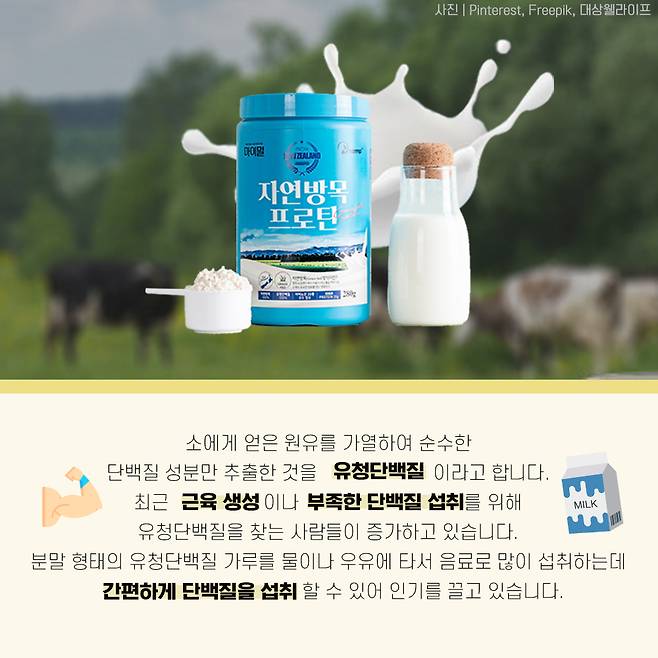 소에게 얻은 원유를 가열하여 순수한 단백질 성분만 추출한 것을 유청단백질이라고 합니다. 최근 근육 생성이나 부족한 단백질 섭취를 위해 유청단백질을 찾는 사람들이 증가하고 있습니다. 분말 형태의 유청단백질 가루를 물이나 우유에 타서 음료로 많이 섭취하는데 간편하게 단백질을 섭취할 수 있어 인기를 끌고 있습니다.