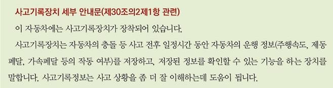 신차를 구입할 때 제작사에서 제공하는 취급 설명서에는 차종에 따라 아래와 같은 사고기록장치 세부 안내문이 표시되기도 한다.