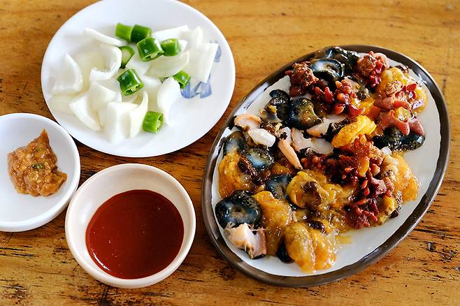 잠시 후 해산물과 라면을 마주할 수 있었는데 무척이나 신선하고 깔끔하게 다듬어진 모습을 볼 수 있었다. 멍게와 해삼, 그리고 소라 등이 접시 위에서 함께 어우러져 있었으며 초장과 된장 그리고 양파, 고추 등이 함께 준비됐다.