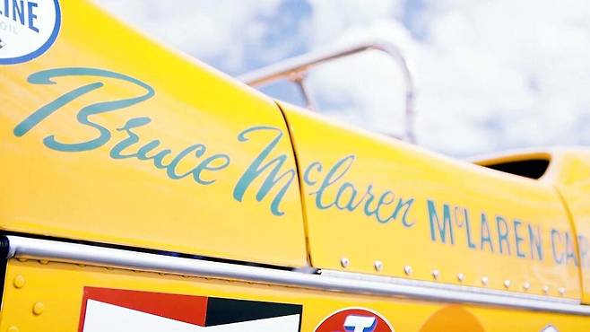 물론 이 차에 적용된 파파야 오렌지는 1967년의 그것과는 조금 다르다. 좀 더 짙고 어두운 오렌지에 펄 느낌이 강한 페인트를 적용했으며, 가운데에 푸른색이 감도는 도브 그레이 스트라이프를 넣었다. 그리고 스트라이프 위에는 오래전 브루스 맥라렌이 있던 시절의 회사 로고인 맥라렌 카즈 레터링을 삽입했으며, 브루스 맥라렌이 탔던 M6A에 적용된 그의 시그니처가 들어갔다.