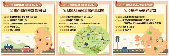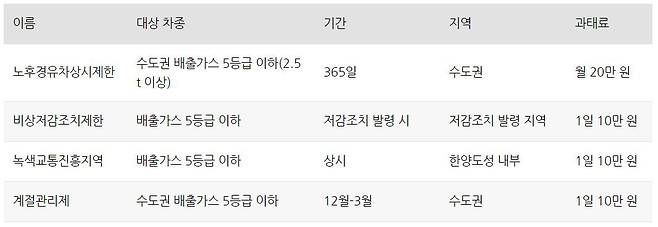 먼저 노후 경유차 운행 제한 제도 간략 소개부터. 맑은 공기를 위해 5등급 경유차를 옥죄는 정부의 그물망은 크게 세 가지다. ‘노후경유차 상시 운행제한’과 ‘비상 저감조치 운행제한,’ 그리고 ‘녹색교통진흥지역’이다. 여기에 최근 12~3월만 시행하는 계절관리제가 더해졌다.