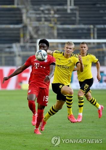 epa08445613 Alphonso Davies (L) of Bayern Munich and Dortmund's Erling Haaland (C) in action during the German Bundesliga soccer match between Borussia Dortmund and FC Bayern Munich at Signal Iduna Park in Dortmund, Germany, 26 May 2020. EPA/Federico Gambarini / POOL DFL regulations prohibit any use of photographs as image sequences and/or quasi-video.
