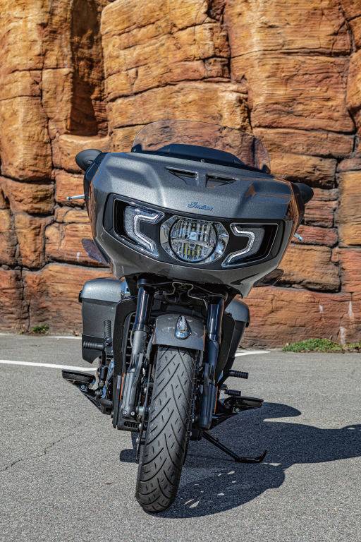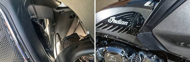 프레임 마운트 방식은 말 그대로 페어링이 프레임에 붙어있어 핸들에 무게를 더하지 않는 방식을 말한다. 가장 큰 장점은 거대한 페어링이 핸들과 함께 움직이지 않기 때문에 핸들링에 영향을 주지 않는다는 것이다. 이쯤에서 할리데이비슨에 관심이 있는 사람이라면 대번에 로드글라이드를 떠올릴 것이다. 전체적인 실루엣부터 구성이 무척 닮았다. 인디언 모터사이클도 이를 숨기기보다 적극적으로 드러내고 있다. 자사의 공식 유튜브 채널에서 ‘챌린저 챌린지’라는 이름으로 로드글라이드와 비교 테스트 영상을 올리고 있을 정도다. 그러고 보니 이름부터 ‘도전자’라는 것은 꽤나 노골적인 작명이다.