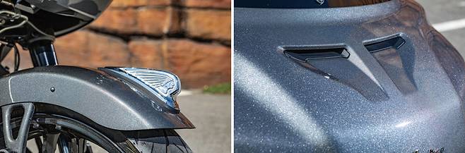 할리데이비슨 로드 글라이드는 오래전부터 만들어온 모델로 자신만의 역사가 있지만 인디언 모터사이클은 이러한 타입의 투어링 모델이 처음이다. 그래서 오히려 완벽하게 현대적인 디자인으로 접근한 것은 영리한 선택이다. 없는 헤리티지를 억지로 씌우려고 했다면 그저 아류로 남았을 것이다. 챌린저의 디자인 책임자인 올라 스테네야드Ola Stenegard는 2018년 초까지 BMW모토라드에서 수석디자이너로 근무했고 HP2 스포트와 S 1000 RR, 그리고 R나인티 등 굵직한 모델을 디자인한 스타 디자이너다. 고전적인 실루엣에 현대적인 디테일로 채우는 것은 그의 장기인데 챌린저에도 그 능력이 십분 발휘되고 있다.