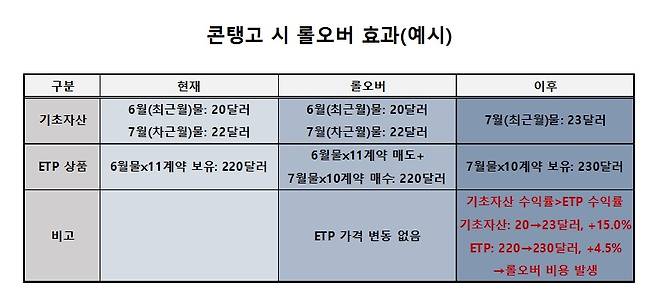 거래소는 "원자재 ETN·ETF 수익률에 롤오버 효과가 직접적인 영향을 주는 만큼 수익성 있는 투자를 위해선 꼼꼼히 따져볼 필요가 있다"면서 "콘탱고 상황에서는 롤오버 비용이 발생해 투자 수익률이 예상보다 낮아질 수 있다"고 조언했다.