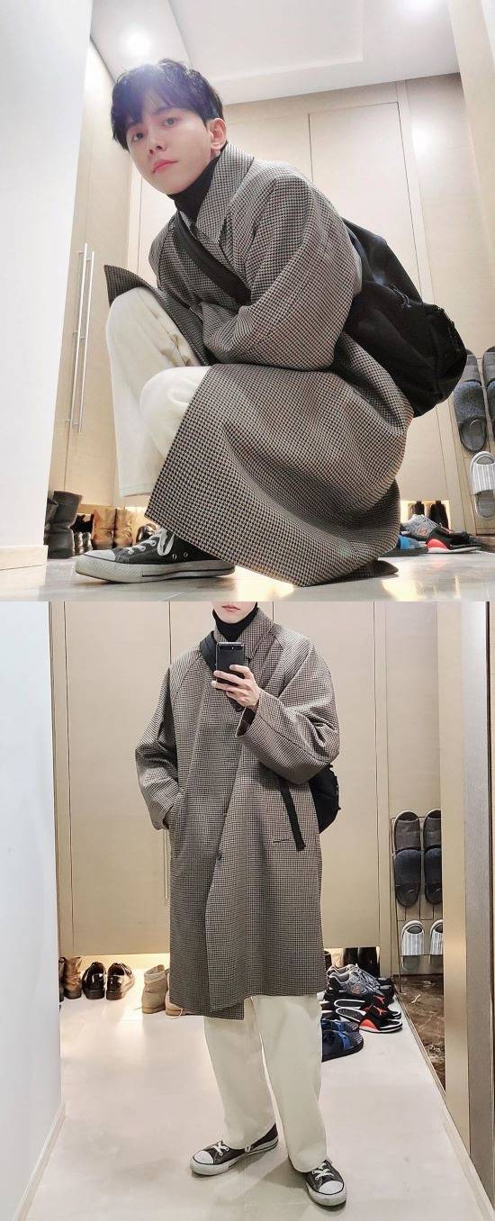 공개된 사진 속 주우재는 체크무늬 코트와 베이지색 바지를 입고 다양한 포즈를 취하고 있다.
