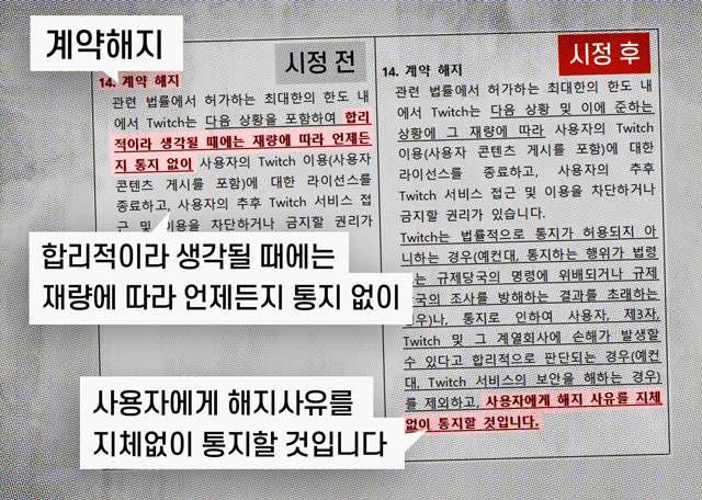 트위치는 우리나라에 적용되는 약관을 바로잡아 다음 달 31일부터 홈페이지에 게시, 적용할 예정입니다. 특히, 릴카·뜨뜨뜨뜨 영구정지 논란에서 문제가 됐던 계약 해지 조항은 '합리적이라 생각될 때는 재량에 따라 언제든 통지 없이 사용자의 이용에 대한 라이선스를 종료한다'는 내용을 '해지 사유를 지체 없이 통지한다'로 개정했습니다.
