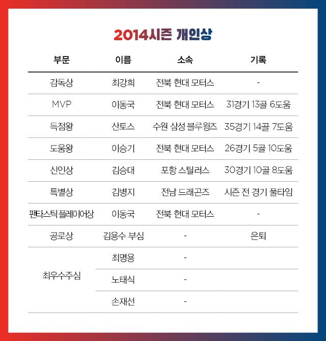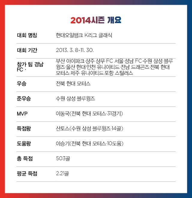마지막까지 우승컵의 향방을 알 수 없었던 2013시즌과 달리 2014시즌 K리그 클래식의 우승 레이스는 너무 싱겁게 끝난 감이 있다. 전북이 압도적 기세로 정상에 올랐기 때문이다. 이해 전북은 38경기를 치러 24승 9무 5패, 승점 81점을 기록했다. 2위 수원 삼성(19승 10무 9패, 승점 67점)과 승점 차가 무려 14점이나 난다. 사실상 순위가 결정되는 시점에서 우승 경쟁은 일찌감치 끝난 상태였다고 봐도 무방하다.
