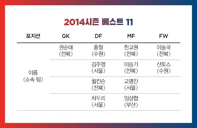 한편 K리그 클래식 베스트 일레븐에는 우승팀 전북 소속 선수들의 존재감이 매우 컸다. 이동국·한교원·이승기·윌킨슨·권순태 등 열한 명의 선수 중 절반에 가까운 다섯 명을 쓸어갔다. 준우승팀 수원은 산토스와 홍철 두 명이 뽑힌 반면, 3위 서울에서는 고명진·차두리·김주영 등 세 명이 선택을 받았다. 그룹 B(하위 그룹)에서는 이해 11골을 터뜨리며 득점 랭킹 5위에 오른 부산의 임상협이 유일하게 베스트 일레븐에 이름을 올렸다.