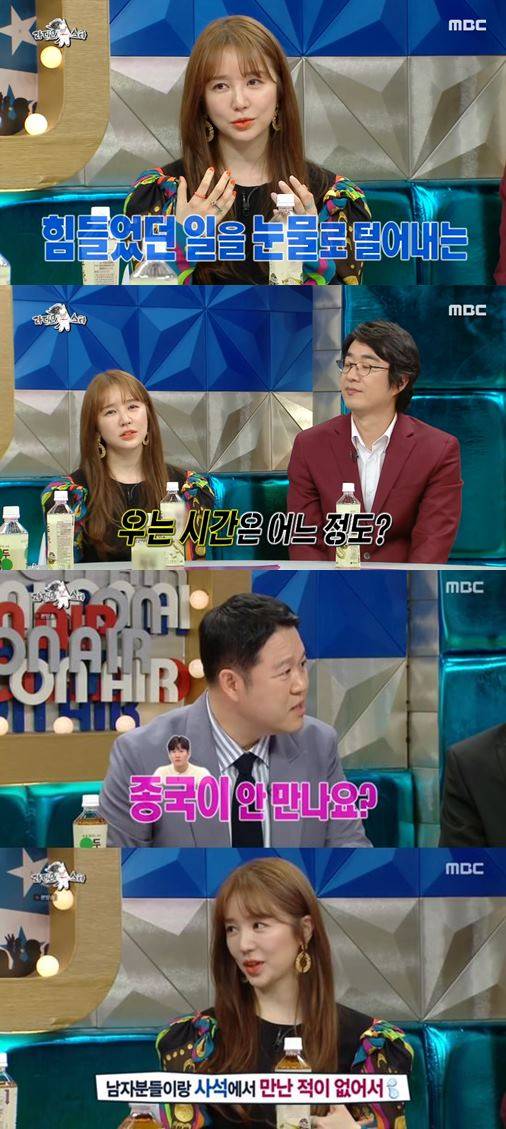 '김종국'의 이름도 나왔다. 김종국과 윤은혜는 과거 예능프로그램에서 러브라인을 그렸던 바. 김구라가 "종국이 안 만나냐"고 질문을 한 것. 이에 윤은혜는 "남자분들이랑 사석에서 만난 적이 없다"며 "외로움에 방황하는 사람들끼리 모여 24시간 카페에서 주로 만난다"고 전했다.