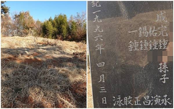 | ▲ 서산시 음암면에 있는 파묘된 고 성완종 전 의원이 묘소(왼쪽)와 성 전 의원의 모친 비석(오른쪽). 비석에 아들 성완종, 성우종, 성석종, 성일종 이름과 손자 성승훈(성완종 전 의원의 장남) 씨의 이름이 새겨있다. |