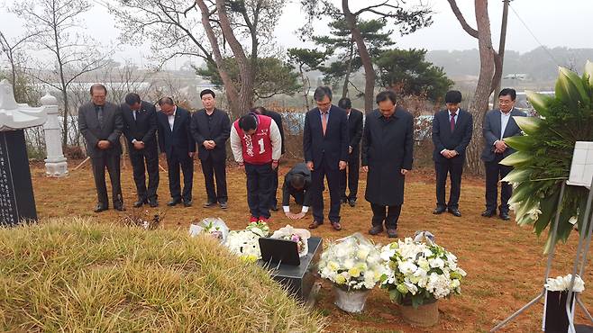 | ▲ 지난 2016년 4.13 총선에서 당선이 확정된 성일종 새누리당 의원이 다음날인 4월 14일 형제, 지지자들과 고 성완종 의원의 선영을 찾아 참배하고있다. |