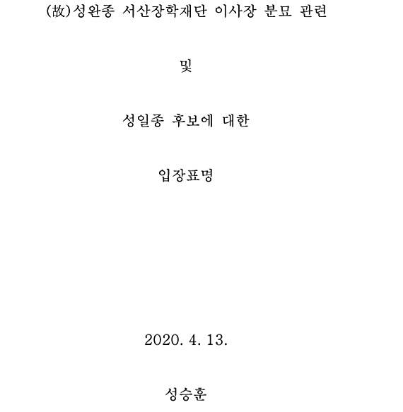| ▲ 고 성완종 전 의원의 장남 성승훈 씨가 보내온 '성완종 서산장학재단 이사장 분묘 관련 및 성일종 후보에 대한 입장표명'의 글. 성 씨는 이날 A4용지 10장 분량의 글에서 사라진 아버지의 마지막 유산, 경남기업의 파산 이유, 아버지의 장례식, 아버지의 분묘를 옮기게 되는 과정 등에 대해 비교적 소상히 밝혔다. 성 씨는 선거 직전 입장을 밝히게 된 데 대해 "최근 언론에 보도된 내용에 관해서는 설명을 올리는 것이 옳은 일이라 생각된다"는 말로 언론 보도에 영향을 받았음을 시사했다. |