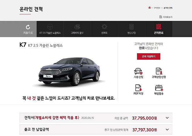단점은 개별소비세 적용 후 변동 가격이 견적 페이지에 반영되지 않았다. 더불어 견적 정보를 별도로 저장할 수 없다.