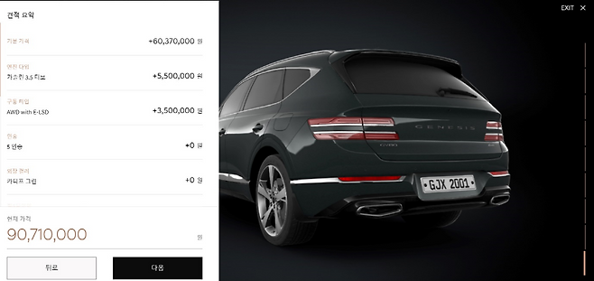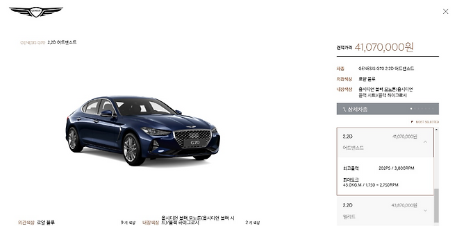 제네시스는 출시 시점에 따라 견적내기 레이아웃이 다르다. 출시 시점이 빠른 G70와 G90는 흰색인 반면 G80과 GV80은 회색으로 구성된다. 전자는 현대차와 유사하며, 후자는 고급화를 고려한 모습이다.