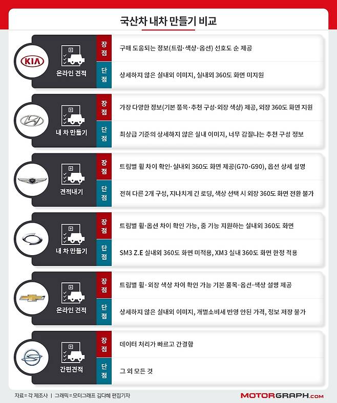 그렇다면 국산차는 어떨까? 지금껏 국산차를 구매하며 한 번도 이용하지 않았던 온라인 견적 서비스를 확인해봤다. 각 브랜드에서 제공하는 온라인 견적 서비스를 간단히 비교하고, 각각의 특징과 장점을 간단히 정리해봤다. 결론부터 이야기하자면, 기아차가 가장 정밀하고 체계적인 정보를 보여줬고 쌍용차는 투박했다. 제네시스와 쉐보레는 트림별로 다른 휠 디자인 차이까지 볼 수 있었다.