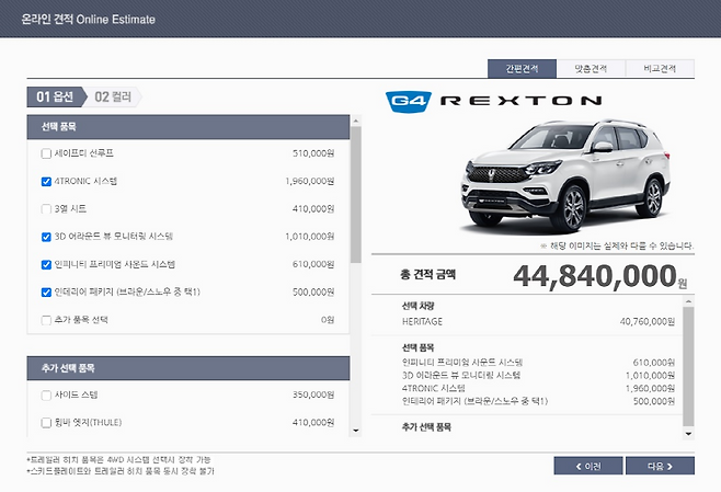 쌍용차는 ‘간편견적’ 취지에 걸맞게 가장 간결한 구성을 갖췄다. 좋게 말해 세월의 흔적과 친숙함이 느껴진다. 레이아웃이 심플해 화면 전환이 가장 빨랐다.