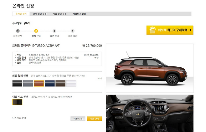 쉐보레는 생각보다 자상하다. 외장, 실내 이미지는 하나로 고정되어 있지만, 트림별 휠이나 외장 색상 차이를 확인할 수 있다. 기본 품목ㆍ옵션(명칭)에 대한 설명도 제공된다. 외장 360도 화면 전환은 개별 홈페이지에서 말리부와 트레일블레이저에 한해 제공된다.