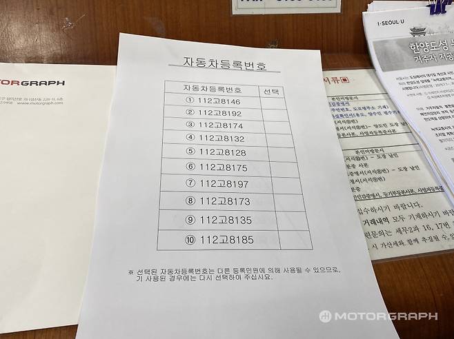 등록 접수를 마치고 서류를 제출하면, 총 10개 번호를 띄어준다. 마음에 드는 번호가 없을 경우 1회 초기화가 가능하다(지역별 상이).