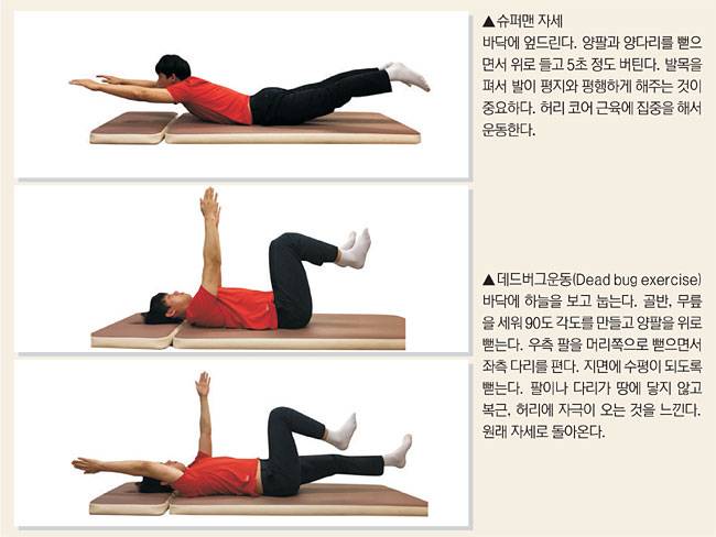 숙이지 않으면서 복근, 허리 근육을 단련시키는 운동법이 '슈퍼맨 자세'와 '데드 버그(Dead bug exercise)' 운동입니다.
