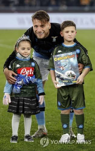 epa08120404 Noemi (L), the four years old child injured during a shooting on 03 May 2019 in Naples, on the pitch with Lazio's Ciro Immobile (C) during the Serie A soccer match between SS Lazio and SSC Napoli at the Olimpico stadium in Rome, Italy, 11 January 2020. EPA/RICCARDO ANTIMIANI