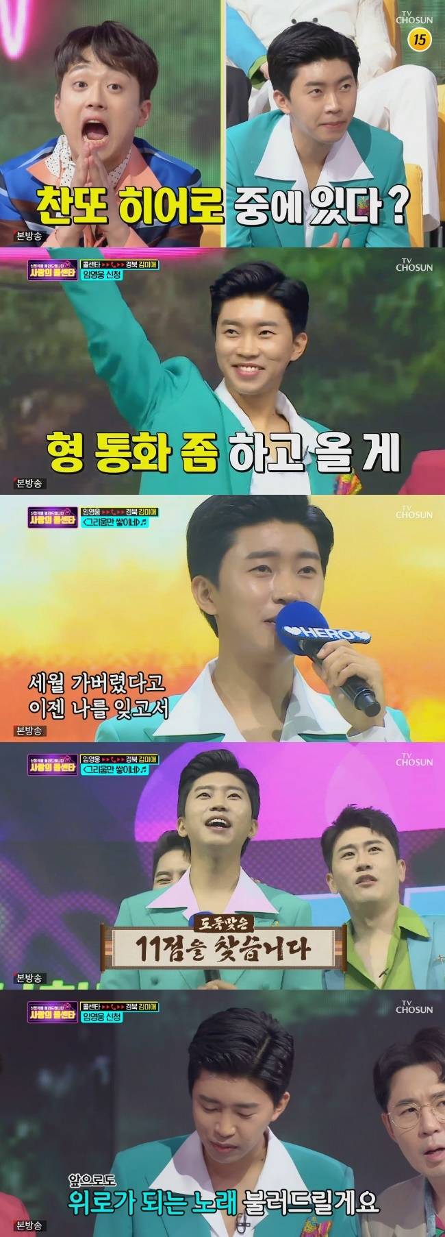이날 경북 경산에 30살 당첨자가 연결되자 이찬원은 “제 학교가 거기였다”며 잔뜩 기대했다. 그러나 당첨자는 임영웅과 동갑이라며 “영웅아”를 외쳤다. 임영웅은 옆에 앉은 이찬원을 밀치고 당당하게 앞으로 나가 웃음을 자아냈다.