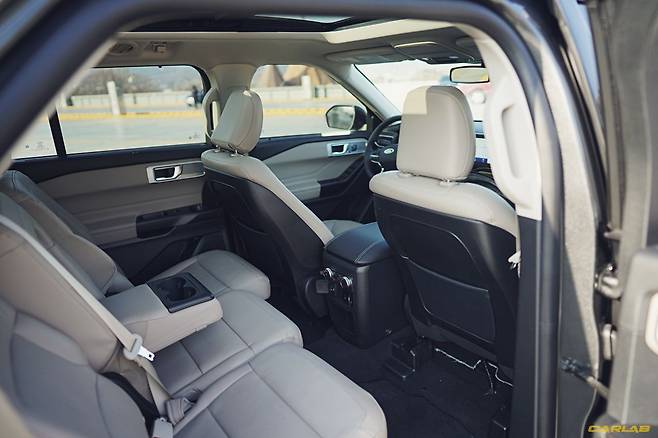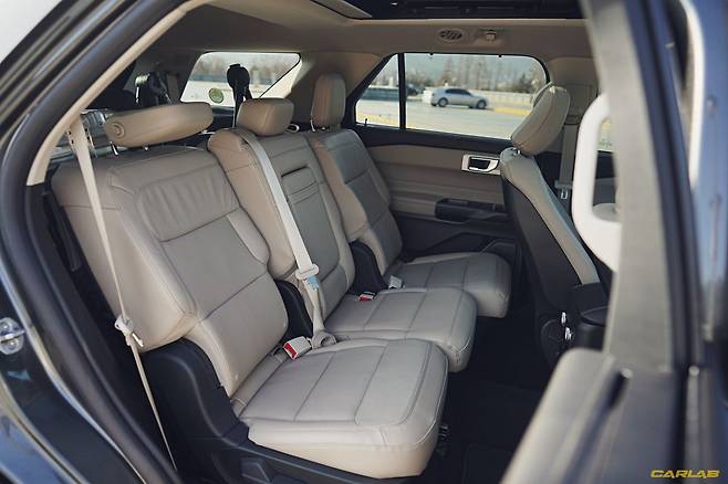 ▲ 2열시트는 이전 세대 익스플로러보다 편해졌다. 등받이와 엉덩이판 각도, 시트 쿠션 경도 등을 조절해 착좌감이 크게 향상됐다. 후방 시야 확보 및 2열 폴딩 용이성을 위해 헤드레스트만 접는 게 가능하다.