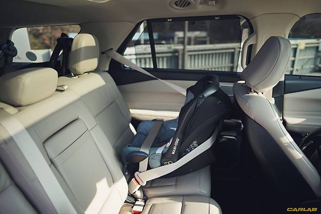 ▲ 2열을 맨뒤로 밀고 운전석을 키 176cm인 기자 몸에 맞춘 상태의 카시트 설치 모습. 카시트 하단 스탠드까지 설치해도 다리 공간을 충분히 활용할 수 있다. 반대로 설치할 경우, 카시트에 앉은 어린이의 발이 (키에 따라 다르겠지만) 운전석 등짝에 좀처럼 닿지 않는 거리다.