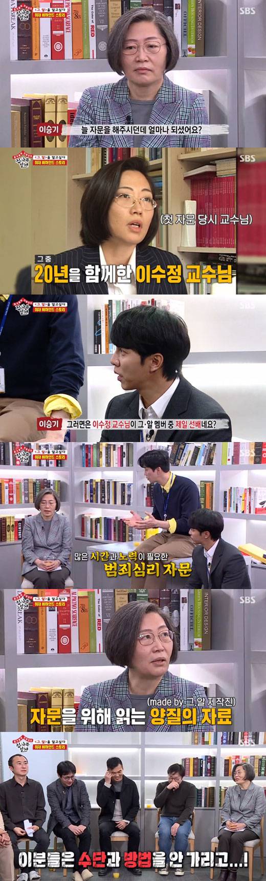 이승기는 이수정 교수에게 "'그것이 알고 싶다'보면 늘 자문을 해주시던데 얼마나 되셨나"라고 말문을 열었고, 이에 이수정은 "'그알'이 거의 30년 됐더라. 저는 한 20년 정도 됐다.