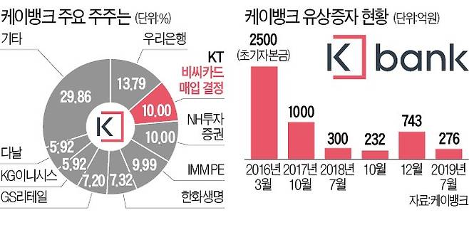비씨카드가 KT를 대신해 유상증자에 참여한다. 인터넷전문은행법에 따르면 정보통신기술기업이 보유할 수 있는 주식의 최대 한도는 34%다. 케이뱅크는 6일 이사회를 통해 5949억원 규모 유상증자를 의결했다. 비씨카드는 기존 주주가 참여하지 않아 발생하는 실권주를 사들여 지분율을 34%로 늘린다는 계획이다.