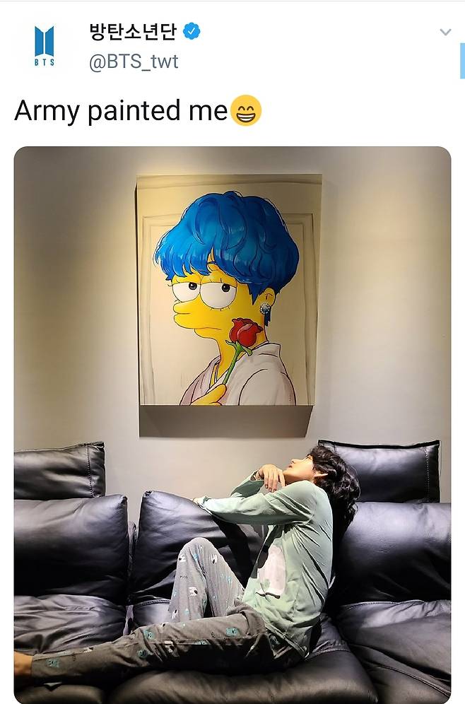 마침내 뷔가 액자로 만들겠다고 한 그림이 공개됐다. 25일 방탄소년단 공식 트위터에 뷔는 "Army painted me(아미가 나를 그렸다)"라는 글과 함께 한 장의 사진을 게재했다. 뷔는 소파에 편하게 기대서 팬이 그린 ‘뷔심슨’ 그림을 보고 있었다.