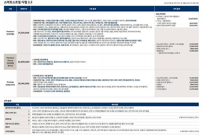 신형 싼타페는 2.2 디젤 모델만 우선 판매하며, 가격은 프리미엄 3122만원, 프레스티지 3514만원, 캘리그래피 3986만원 등이다(개별소비세 3.5% 기준). 신차 구매를 고민하는 이들을 위해 가격 및 옵션표를 정리해봤다.