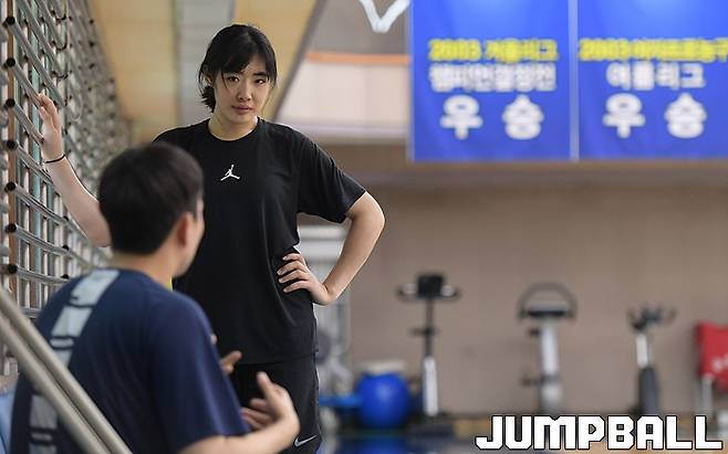 [점프볼=서울/박상혁 기자] 5일 서울시 성북구 장위동에 위치한 우리은행 연습체육관에서 우리은행 선수단이 다시 한번 우승을 향해 구슬땀을 흘리고 있다. 우리은행 김해지가 이재원 트레이너와 대화를 나누고 있다.