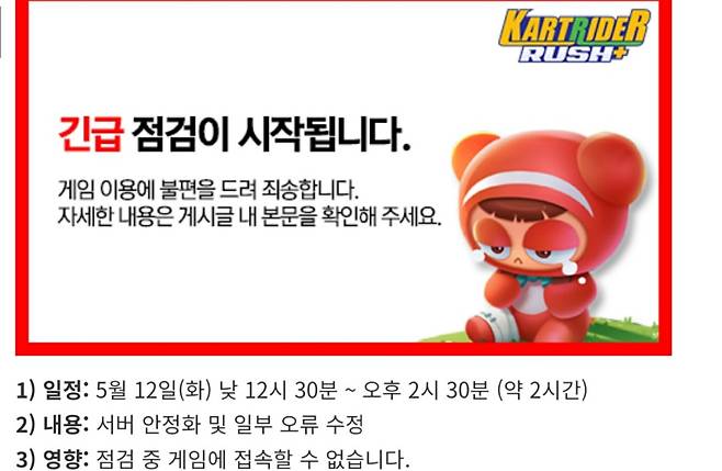 넥슨의 카트라이더 러쉬플러스가 출시하자마자 오류가 발생해 긴급점검에 들어갔다.