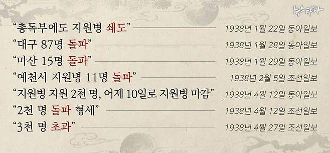 조선총독부가 지원병 제도 실시를 발표한 이틀 뒤인 1938년 1월 18일, 조선일보는 ‘벌써 지원자 속출’이라는 제목의 기사를 냈고, 같은 날 동아일보도 ‘지원병 희망자가 속출’한다고 보도했다.