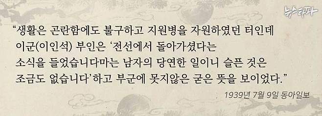 동아일보는 1939년 7월 9일 고 이인석의 유족을 만나 ‘이인석 가정 방문기’ 기사를 작성했는데 “전사(戰死)는 남자의 당연사”라며 이인석의 부인이 다음과 같이 말했다고 크게 보도했다.