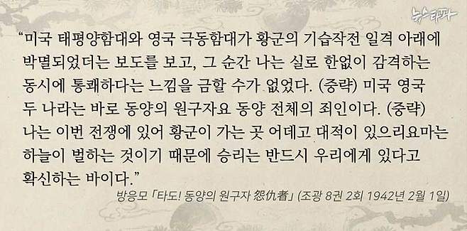 이신철 역사디자인연구소 소장은 “전쟁의 참상이라든지 개인의 아픔과 희생에 관한 부분은 전혀 읽을 수 없고 영웅화를 통해 일본이 전쟁에서 이길 수 있고 조선인도 침략 전쟁에 기여한다는 것을 강조해 전쟁을 미화하고 있다”고 지적했다.