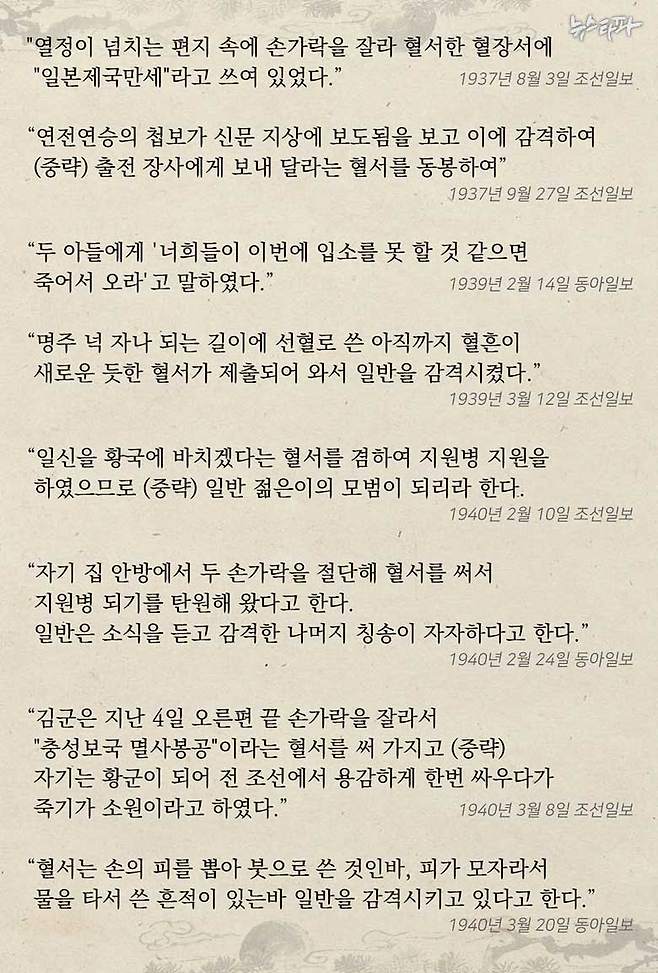 조선과 동아일보, 두 신문의 중일전쟁과 지원병 관련 기사에는 ‘혈서(血書)’라는 단어가 자주 등장한다. 지원병에 뽑아달라며 ‘천황폐하 만세’와 ‘일본제국 만세’ 혈서를 쓴 청년을 소개했고, 혈서와 함께 두 아들에게 입대를 못 하면 죽어 오라고 했다는 아버지의 당부를 보도하기도 했다.