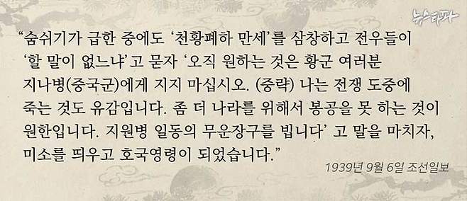 1939년 중국 전투에서 첫 조선인 지원병 사망자가 나왔다. 충북 옥천군 출신 ‘이인석’이었다. 조선과 동아, 두 신문은 이인석을 전쟁 영웅으로 만들면서, 침략전쟁의 선동 수단으로 이용했다. 전쟁의 비극이나 억울한 죽음, 그리고 유족의 슬픔은 이들 신문의 안중에 없었다.