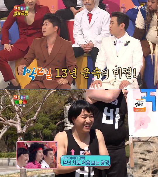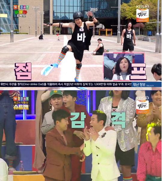 그런가 하면 김종민은 ‘바바바 차력단’ 코너에 출연해 기상천외한 챌린지를 펼쳤다. 먼저 그는 김수영의 빅 사이즈 옷을 뺏어 입고 등장해 헐렁한 얼간미를 자랑했다. 그런가 하면 “바” 한 글자 외에는 언어를 잃은(?) 모습으로 어리버리한 ‘바바바 브라더스’에 완벽 동화해 시작부터 웃음 버튼을 저격했다.