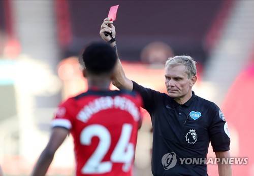 epa08509335 Referee Graham Scott (R) shows the red card to Southampton's Jack Stephens (not pictured) during the English Premier League soccer match between Southampton FC and Arsenal FC in Southampton, Britain, 25 June 2020. EPA/Cath Ivill/NMC/Pool EDITORIAL USE ONLY. No use with unauthorized audio, video, data, fixture lists, club/league logos or 'live' services. Online in-match use limited to 120 images, no video emulation. No use in betting, games or single club/league/player publications.