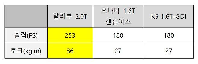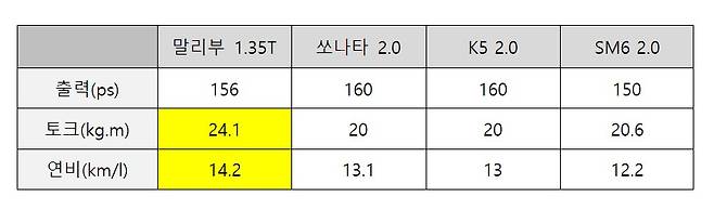 적은 배기량에도 우월한 토크 성능 역시 강점이다. 말리부 E 터보 모델은 최고출력 156마력 최대토크 24.1kg.m을 발휘해 2.0 자연흡기 모델보다 토크가 세다. 출력도 큰 차이가 나지 않는다.