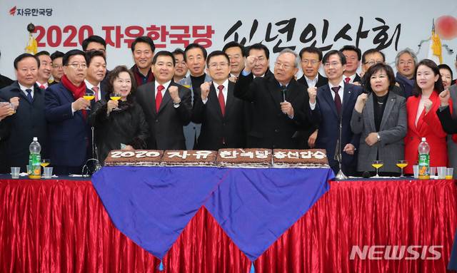 [서울=뉴시스] 장세영 기자 = 자유한국당 박관용 상임고문이 황교안 대표, 심재철 원내대표를 비롯한 참석자들과 함께 1일 서울 영등포 자유한국당 당사에서 열린 2020 자유한국당 신년인사회에 참석해 신년 구호를 외치고 있다. 2020.01.01.