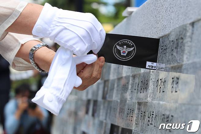 (대구=뉴스1) 공정식 기자 = 30일 오전 대구지방경찰청 경찰시민공원에서 열린 호국순직경찰 추모비 제막식에 참석한 유가족들이 추모비 명패를 봉안하고 있다. 2020.6.30/뉴스1