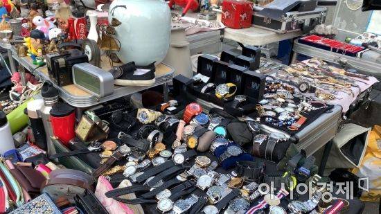 시장 초입에 들어서니 평일임에도 사람들로 북적였다. 양옆으로는 구제 의류를 판매하는 빈티지숍들과 삼성 '마이마이' 같은 이전 세대 전자제품을 파는 노점상들이 즐비했다. 매대에는 가수 '소방차'가 입었을 듯한 청재킷이나 1990년대 초등학생 교복같은 떡볶이 코트 등 향수를 느낄 수 있는 옷들이 걸려 있었다. 그 앞에는 필름 카메라나 접시, 시계, 재봉틀, 라이터 등 생활용품들이 무심하게 널려있었다.