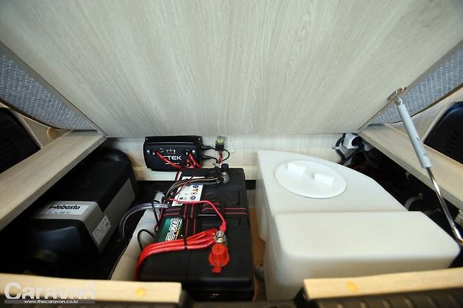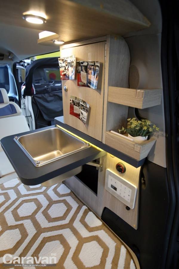 로디의 후면부 우측에는 접이식 싱크대가 설치되어 있고 라이트닝 패키지로 조명과 시거 소켓, usb 충전 단자, 220V 콘센트, 하단 수납함, 독일 베바스토 무시동 히터, 15.6인치 TV, 청수탱크 18리터, 수전, 메인 컨트롤 패널 등의 장치가 결합된다.