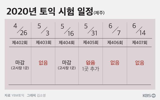 한국 토익위원회는 "코로나19 여파에 제주 지역 중고등학교를 토익 고사장으로 활용하는 데 어려움이 있다"며 "상반기 공무원 시험과 기업 채용을 준비하는 수험생들의 불편이 예상된다"고 설명했습니다.