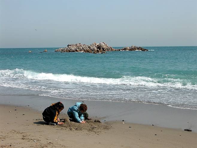 | ▲ 경주 대왕암과 어린이들 추운 겨울에도 아이들은 모래놀이를 즐긴다. 답사보다 바다와 모래가 좋은 아이들의 동심이다. 이렇듯 대왕암은 이제 평화의 상징이 되어야 한다. |