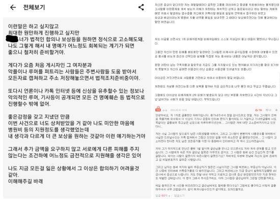공개된 메시지엔 최초 폭로자 등을 대상으로 법적조치를 준비 중이라는 내용이 담겼다. 이어 신상을 유추할 수 있는 정보나 악의적인 루머, 기사 등이 공개되면 명예훼손 등 법적으로 진행할 수밖에 없다는 내용도 담겼다. 네티즌은 말미에 “나에게도 자살을 하겠다는 등 다른 보복을 할까봐 심리적으로 불안하고 무섭다”고 호소했다.