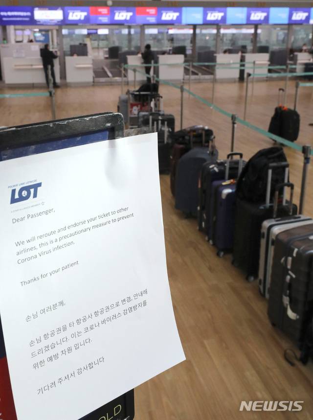 [인천공항=뉴시스] 전진환 기자 = 13일 인천공항에서 폴란드 바르샤바로 출발하는 LOT폴란드 항공편이 결항된 가운데 발권창구 앞에 신종 코로나바이러스 감염증(코로나19) 예방 차원에서 타 항공사 항공권으로 변경, 안내하겠다는 안내문이 붙어 있다. 지난 10일 들어온 이 항공편에서 확진자가 나와 방역당국은 13일 비행기에 대한 긴급 방역을 실시했다. 2020.03.13.